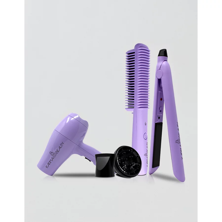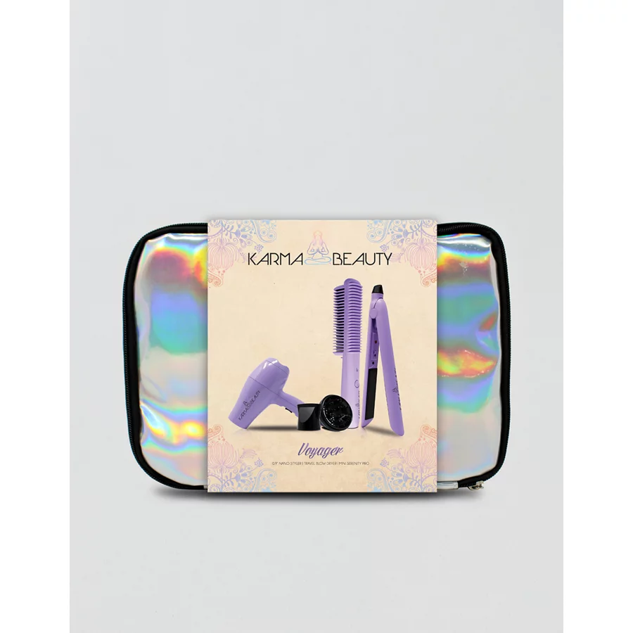 Includes a 0.9 Ceramic Flat Iron, compact Travel Blow Dryer, Mini Serenity Heated Styling CombNegative ion, nano silver & far