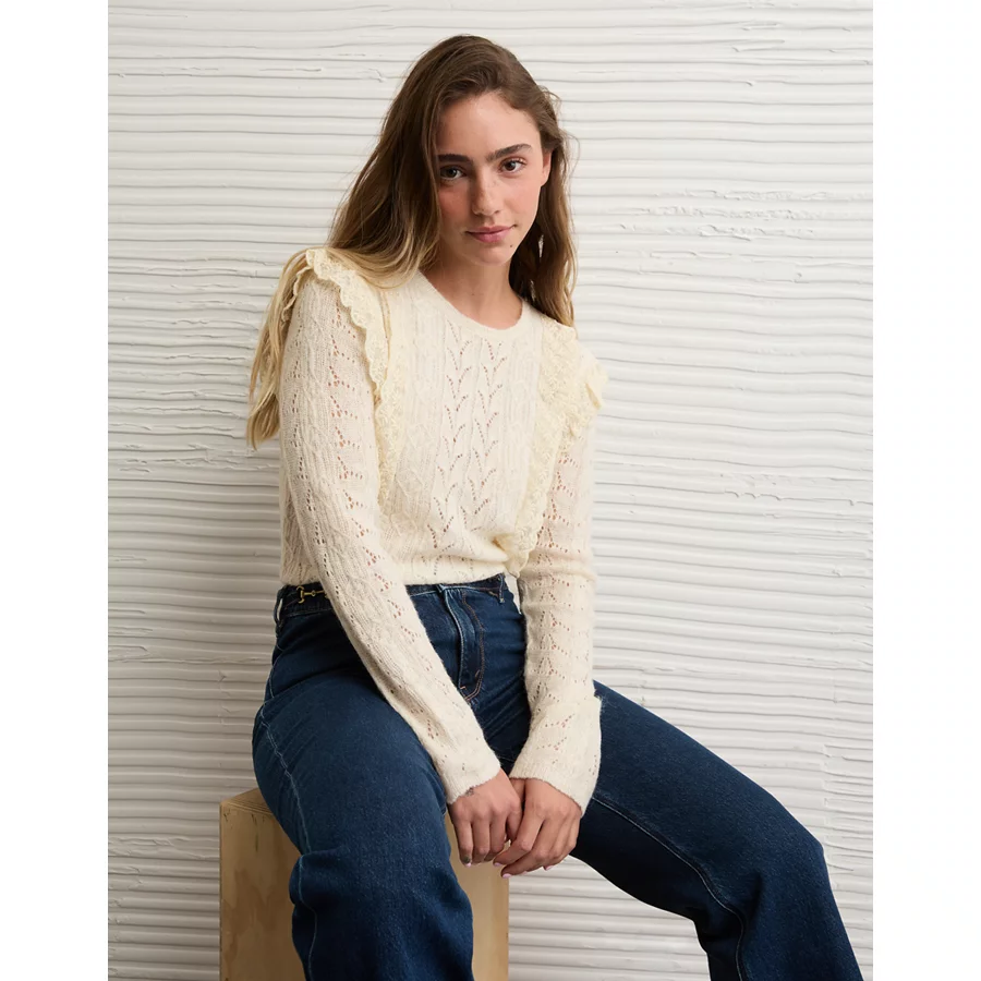 Lightweight sweater knitCrew neckShoulder ruffle details 49% Recycled Polyester, 36% Acrylic, 15% NylonMachine washImported Classic fit & length