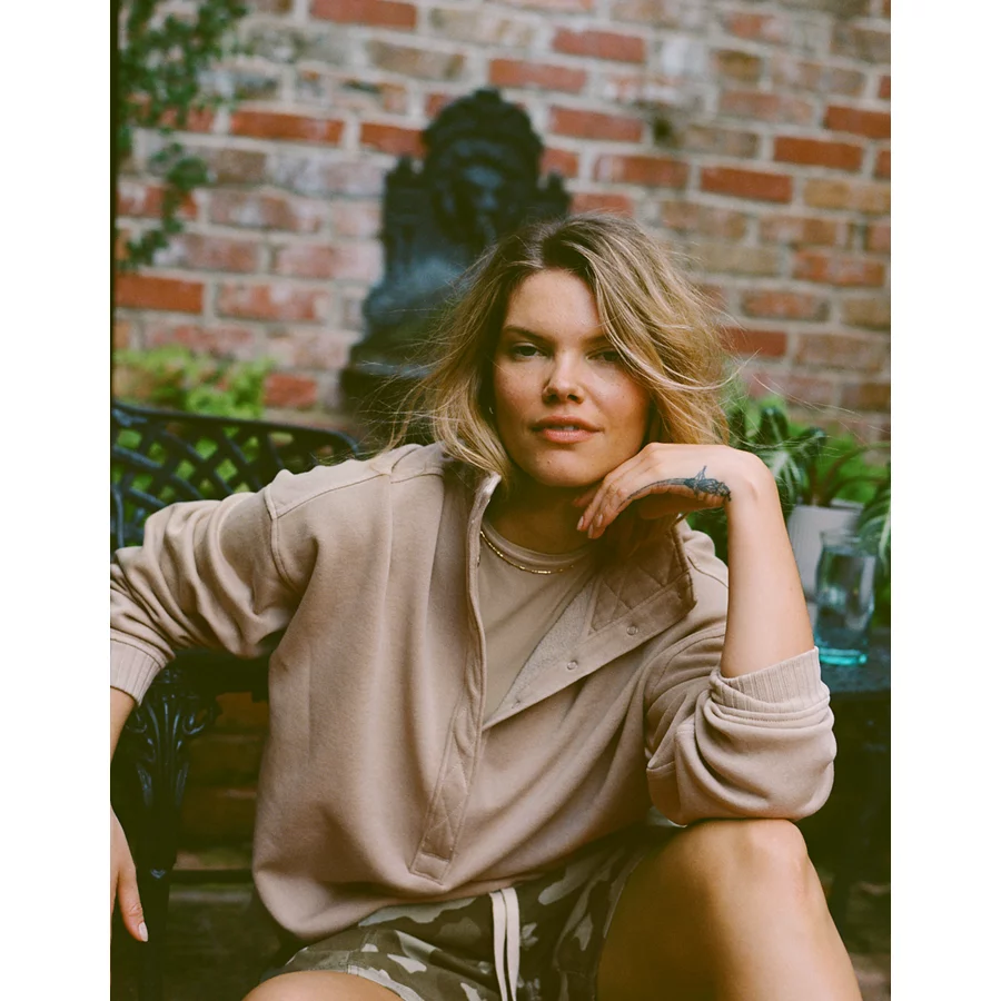 Real Good Everyday fleeceRibbed trim on the cuffs and hemQuilted deets on the neckline and placketThis style is washed so