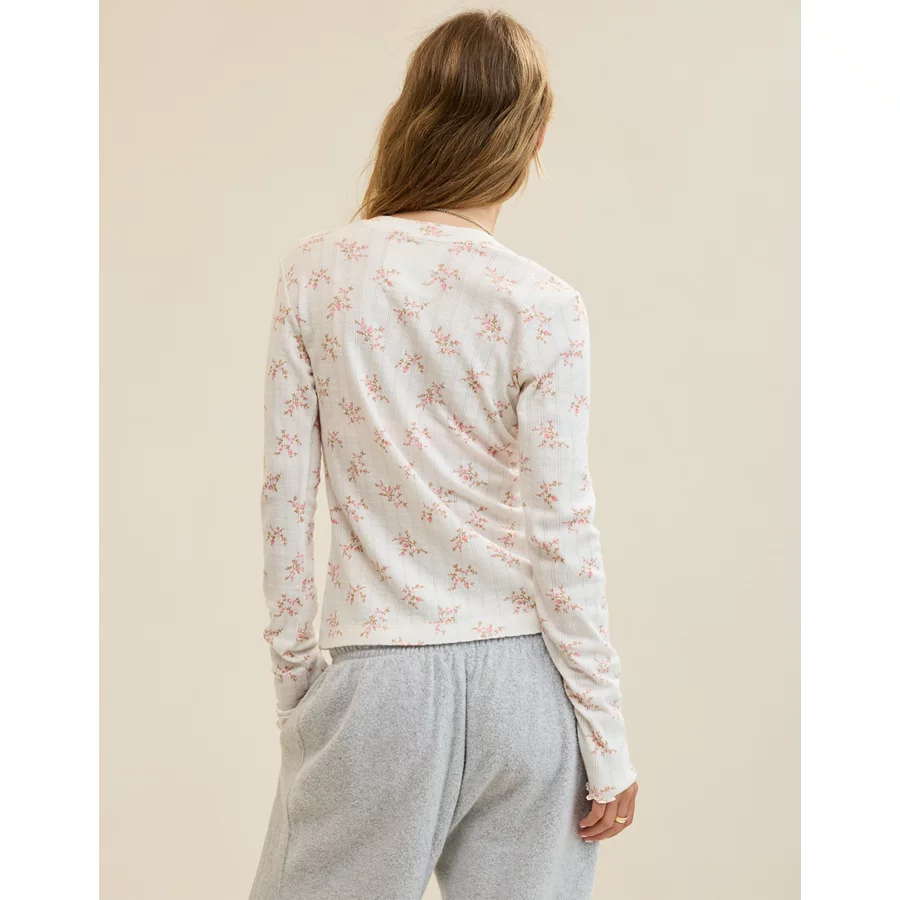Cozy pointelle fabricHigh crew necklineSnap closure Long sleeve with lettuce hem detail 100% CottonMachine washImported Classic lengthFitted