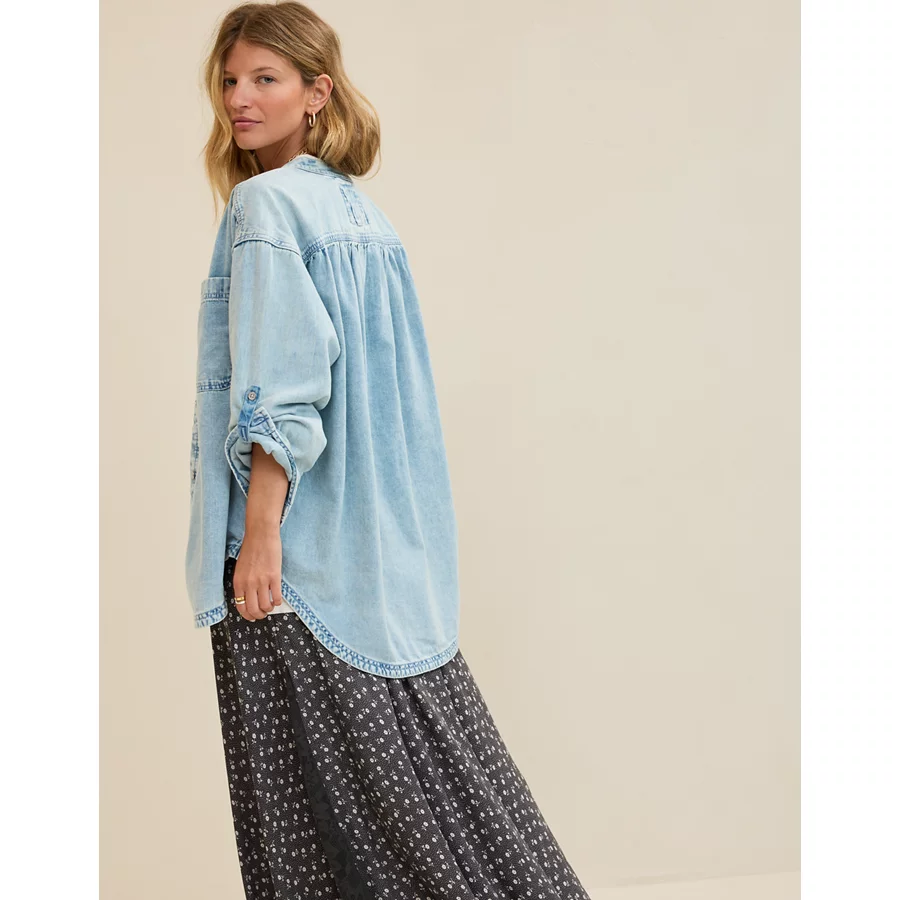 Soft twillDouble breasted pockets Mandarin collarShirring at shoulder sleevesCurved hems 100% CottonMachine washImported Longer lengthOversized fit