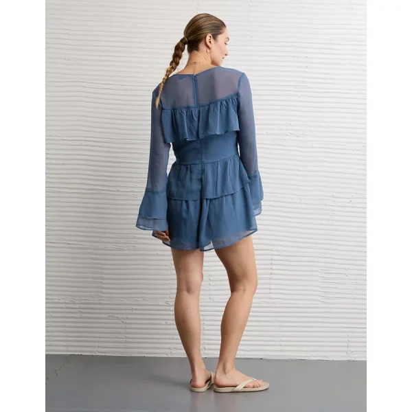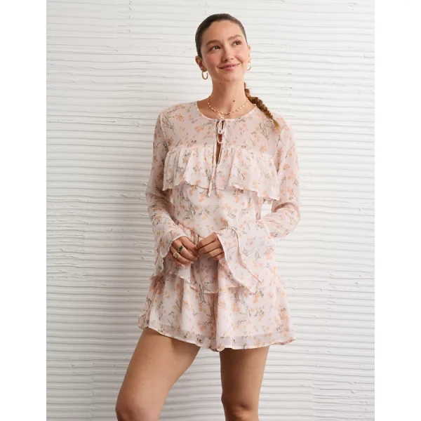 Notch neck with strings for tyingRuffles at bust & waistBell sleeves 100% Recycled PolyesterMachine washImported Classic silhouetteMini lengthLong sleeves
