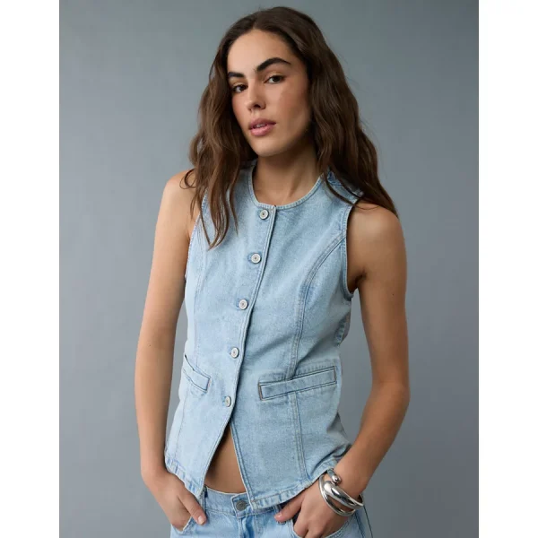 AE Crew Neck Button-Up Denim Vest – Light Wash