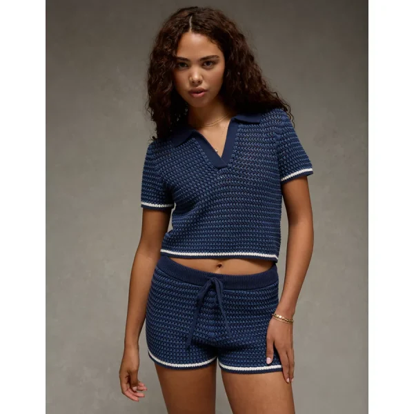 AE Cropped Crochet Sweater Polo Shirt – Midnight