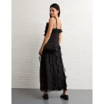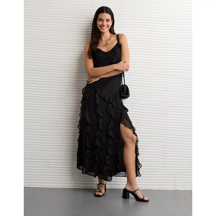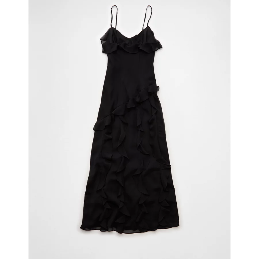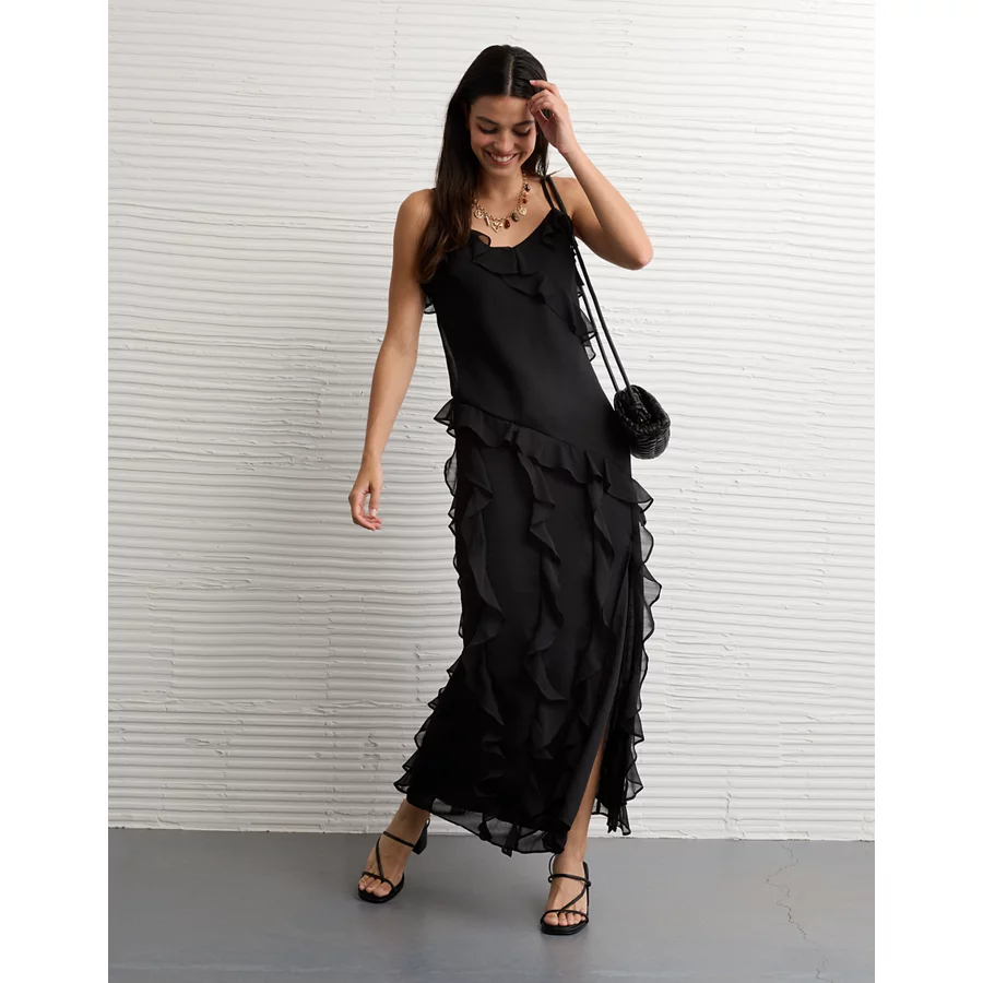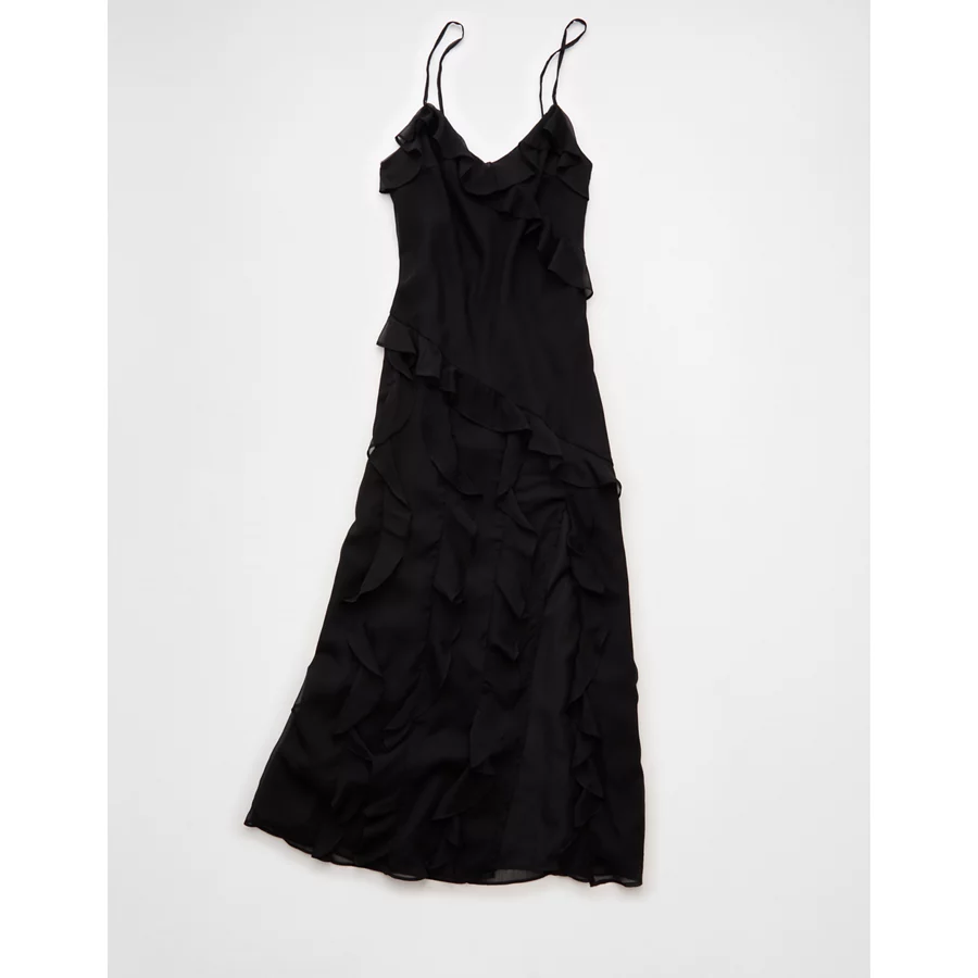AE Asymmetrical Ruffle Maxi Slip Dress – Black