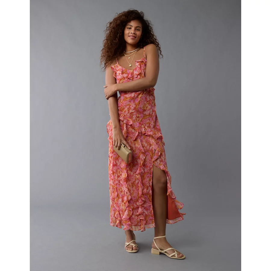 AE Asymmetrical Ruffle Maxi Slip Dress – Pink