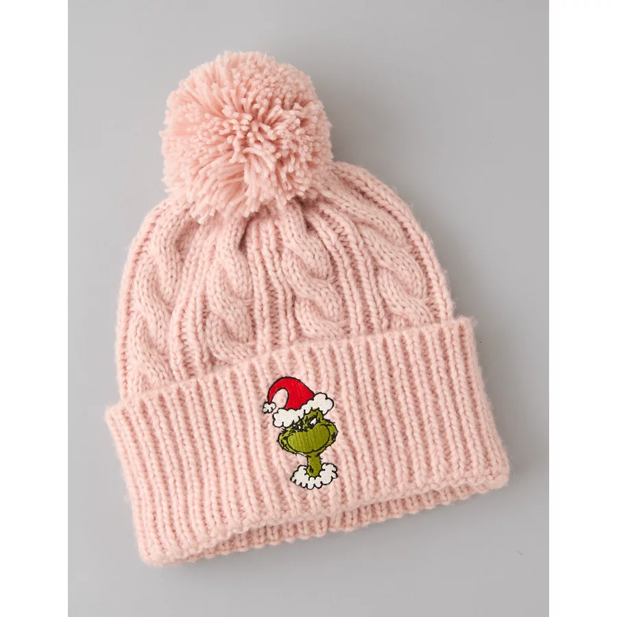 AE Embroidered Grinch Cable-Knit Beanie – Dusty Pink