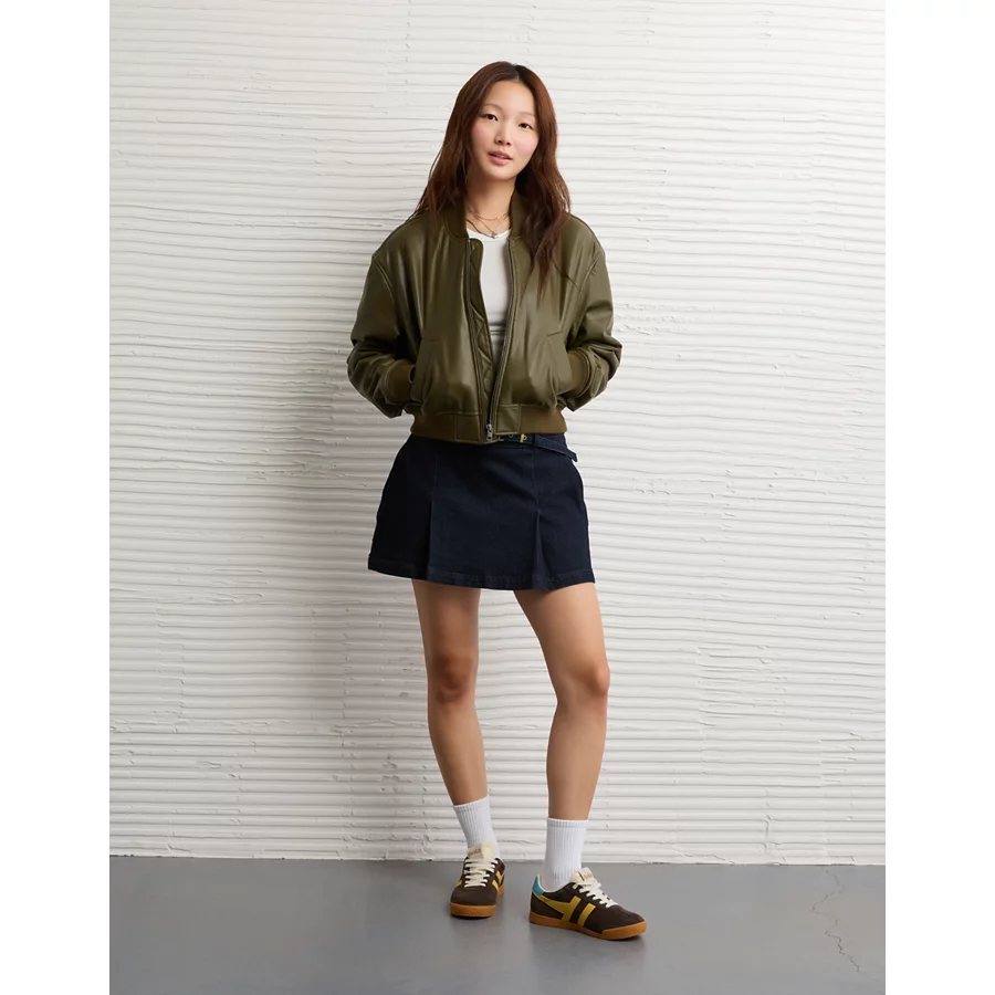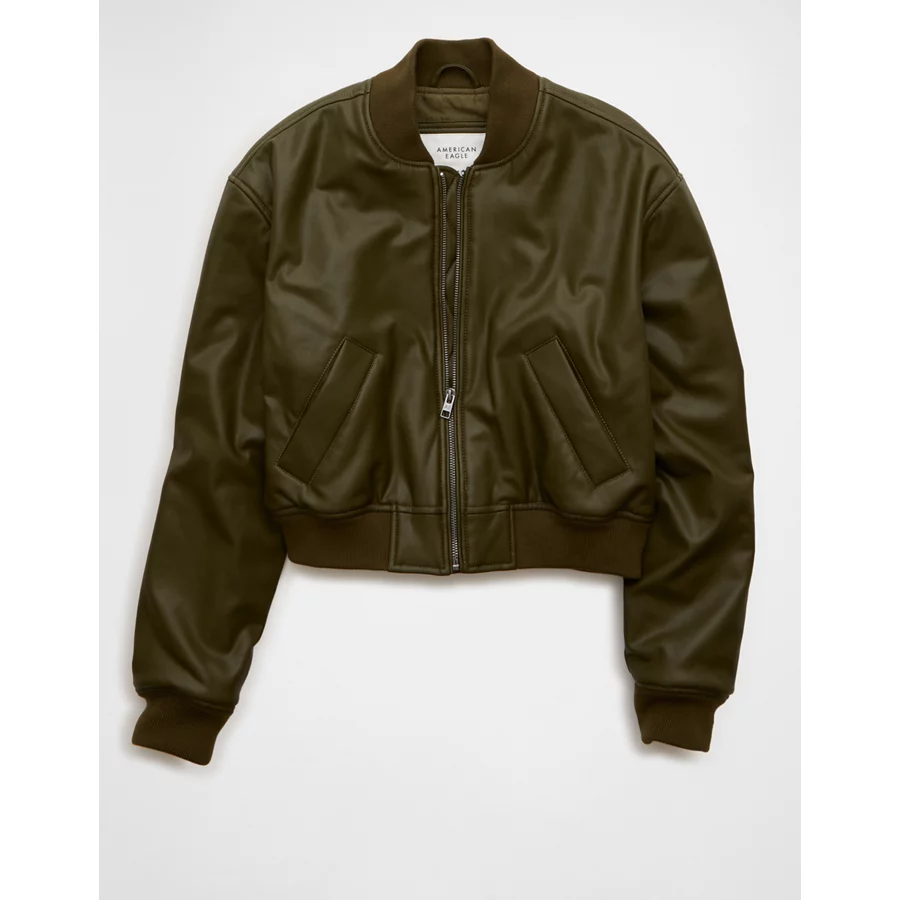 AE Faux Leather Cropped Bomber Jacket – Olive