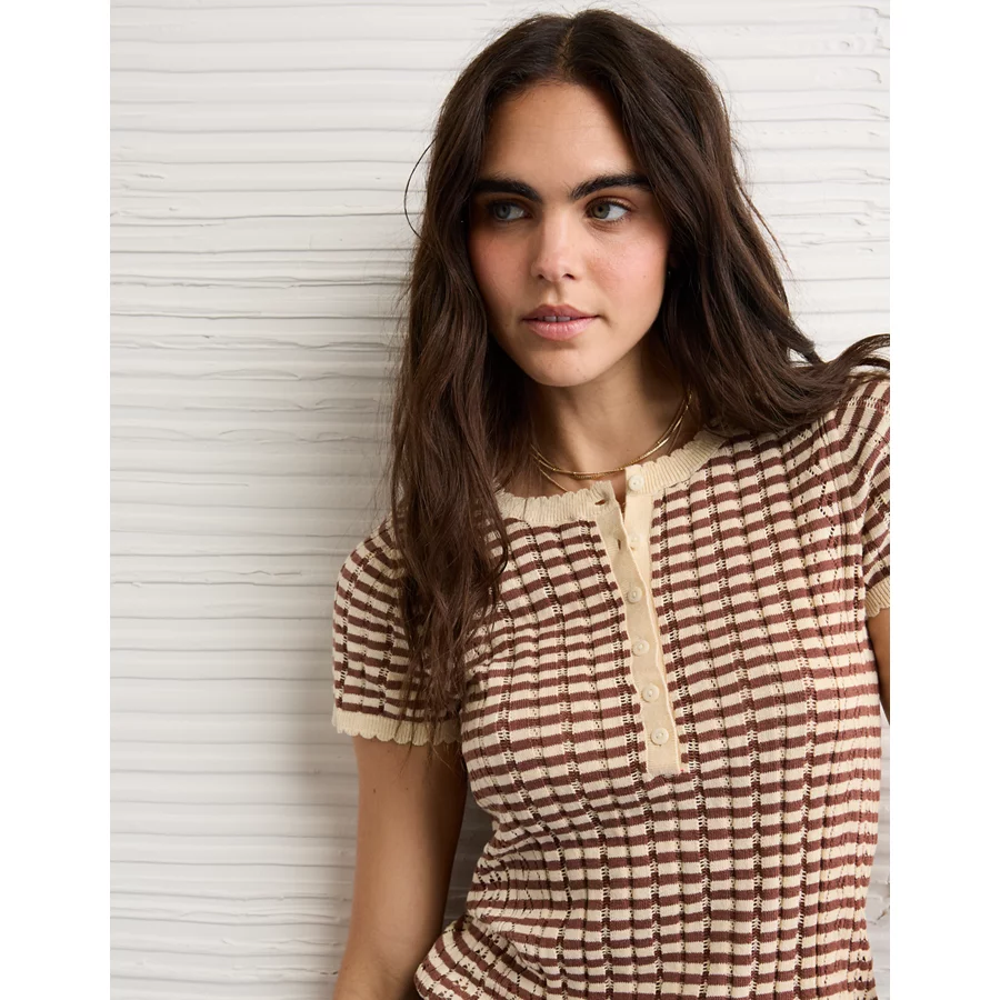 AE Henley Pointelle Sweater T-Shirt - Brown