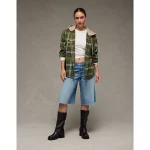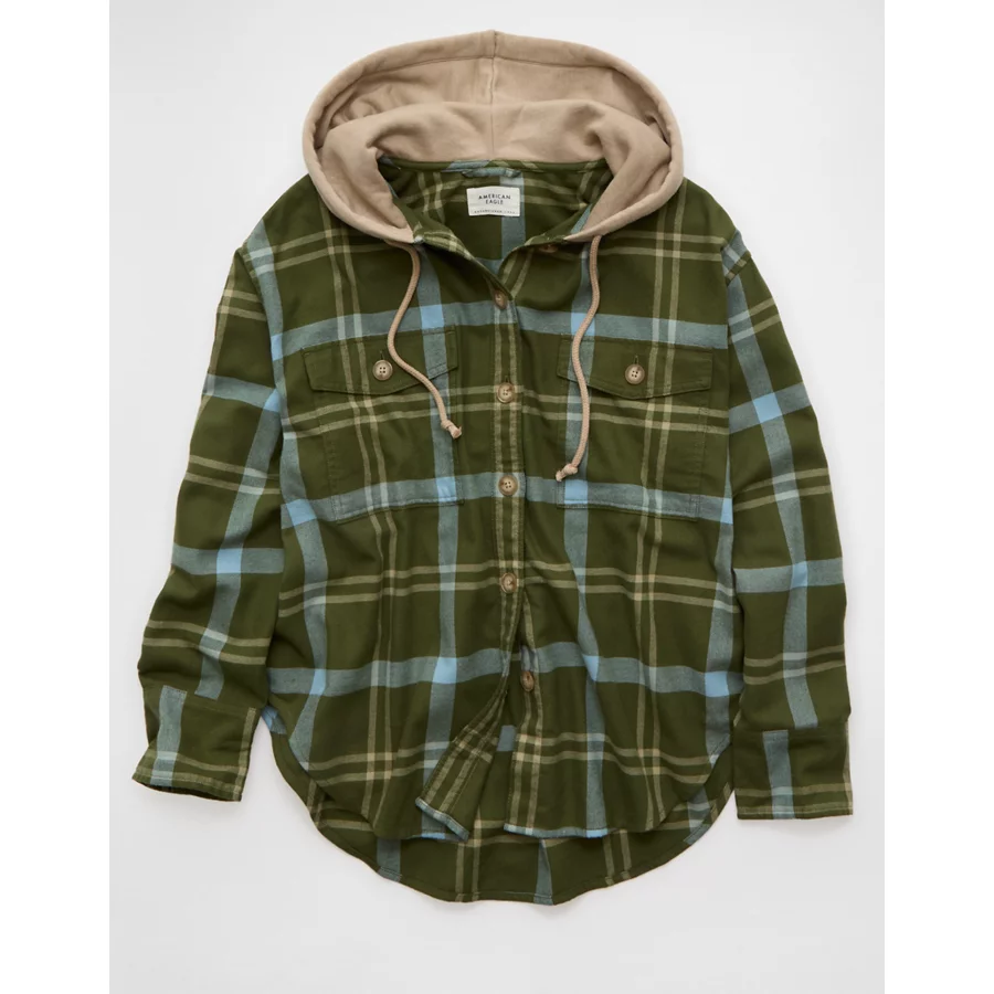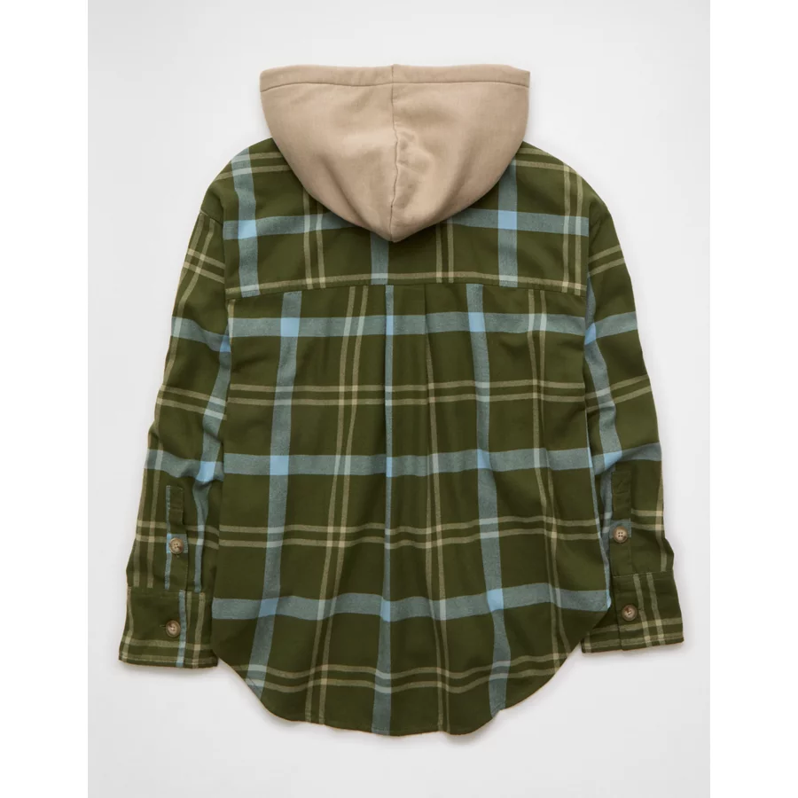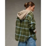 AE Plaid Hooded Button-Up Shirt – Green