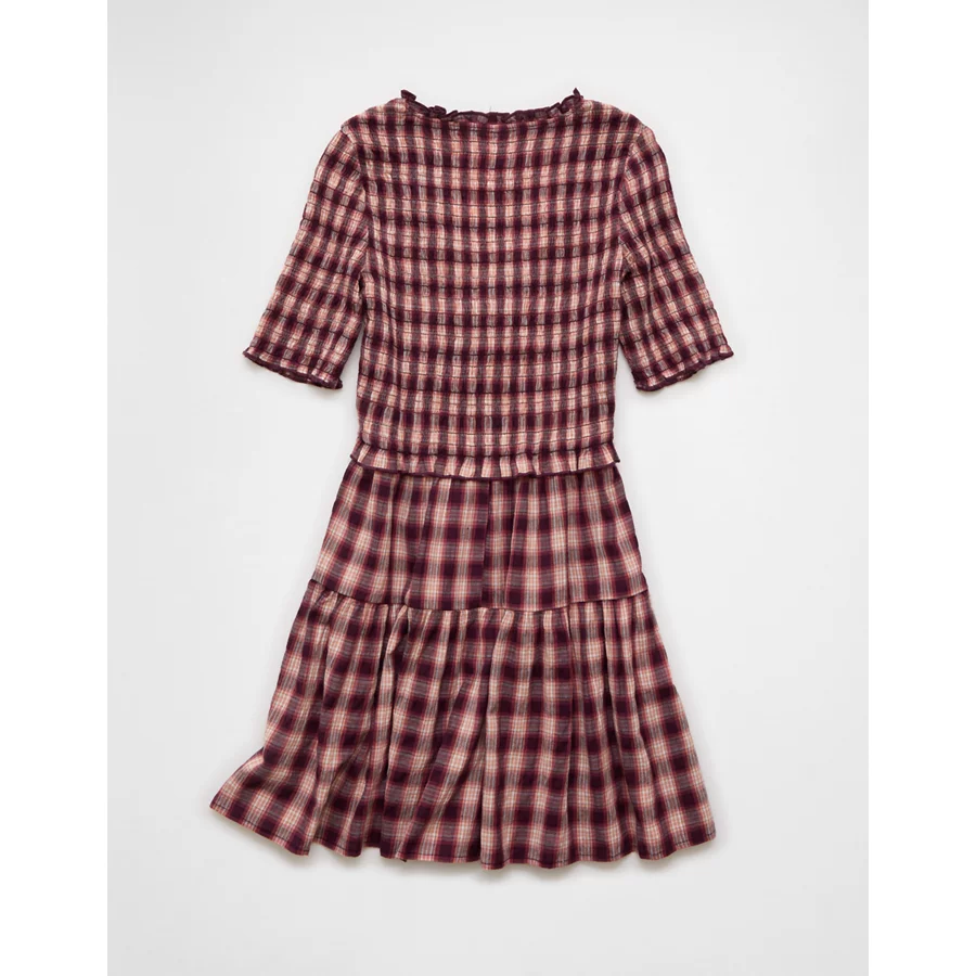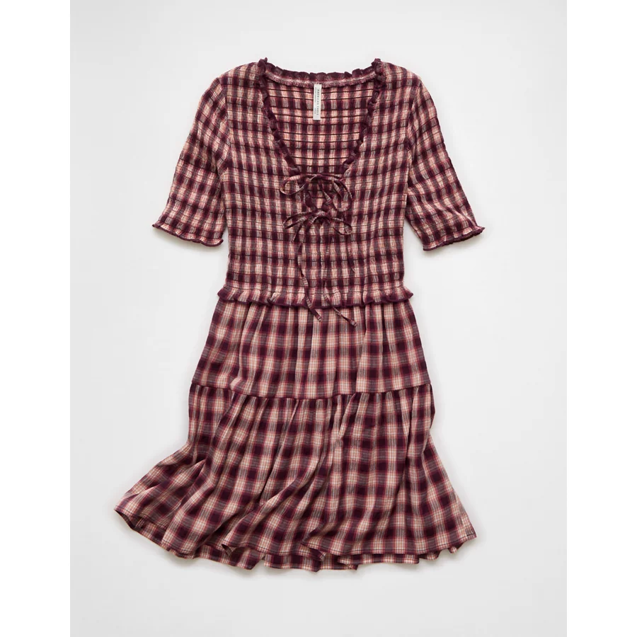 AE Puff Sleeve Tie Front Plaid Mini Dress – Burgundy