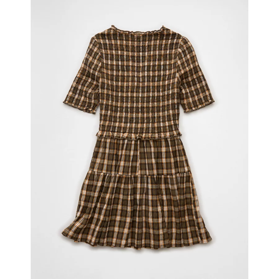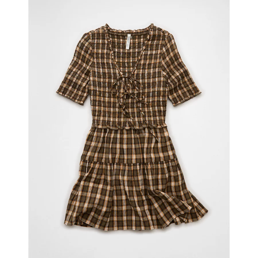 AE Puff Sleeve Tie Front Plaid Mini Dress – Green