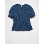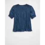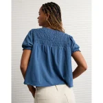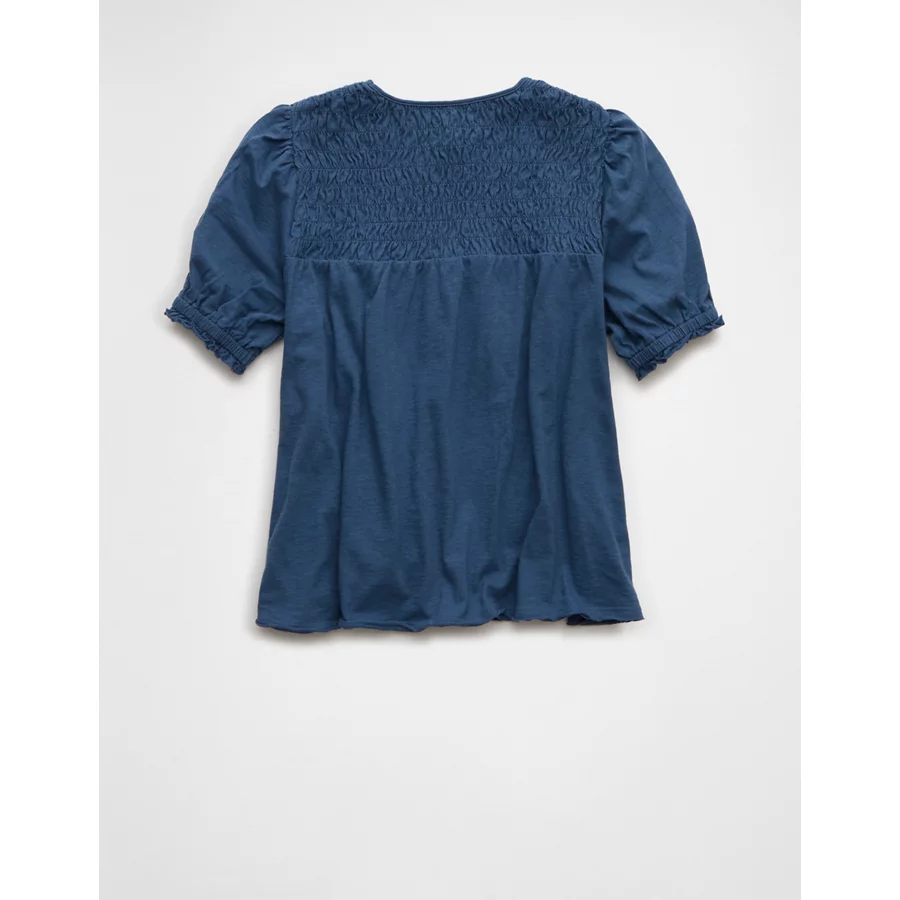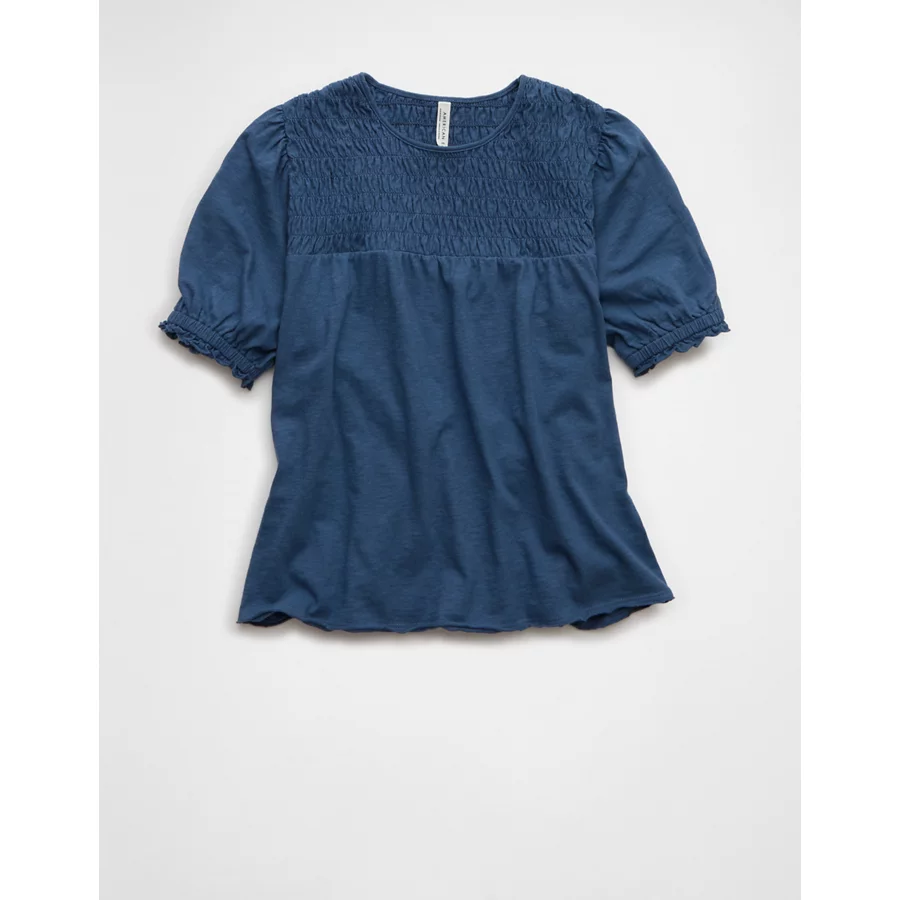 AE Sunchaser High Neck Puff Sleeve Smocked T-Shirt – Navy