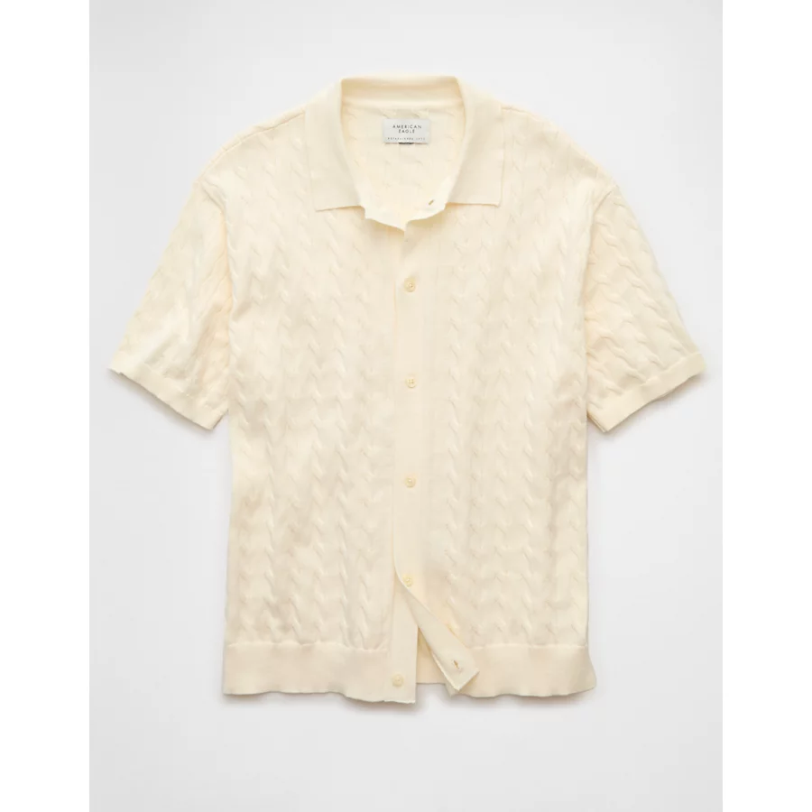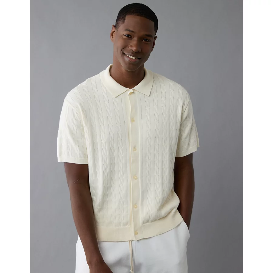 AE Weekend Cable Knit Button-Up Sweater Polo Shirt – Cream