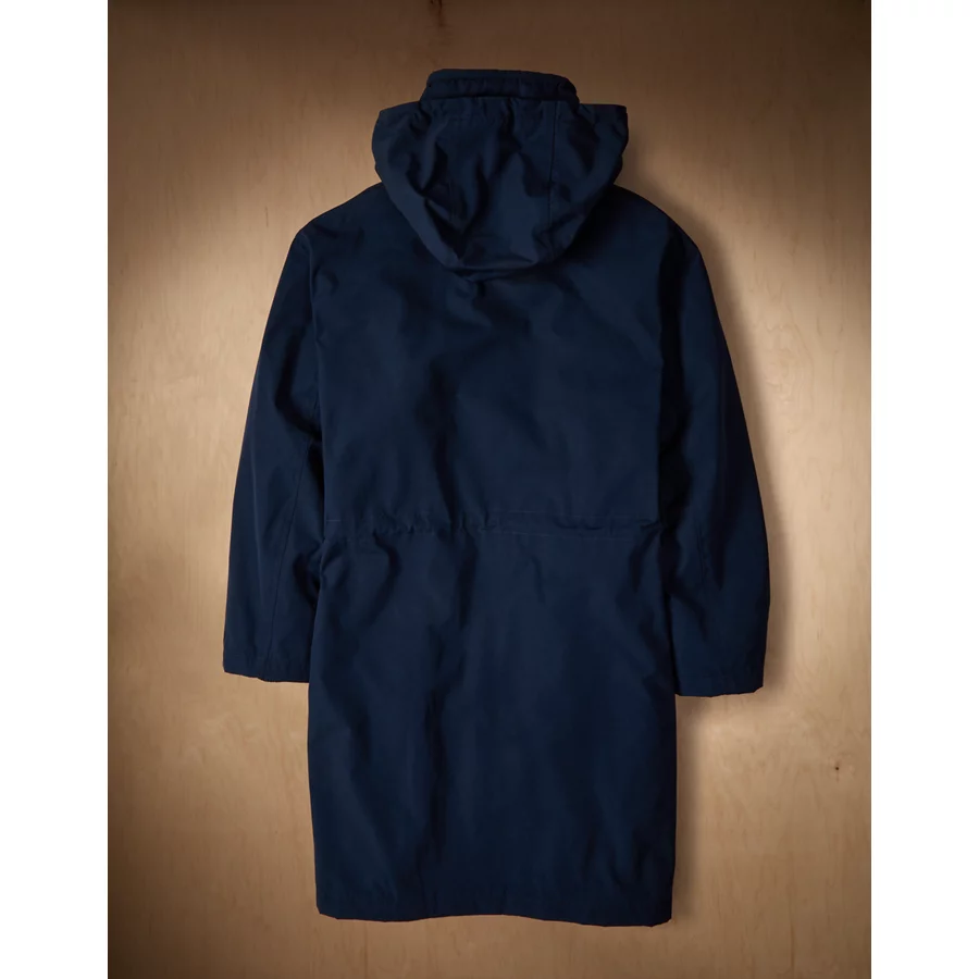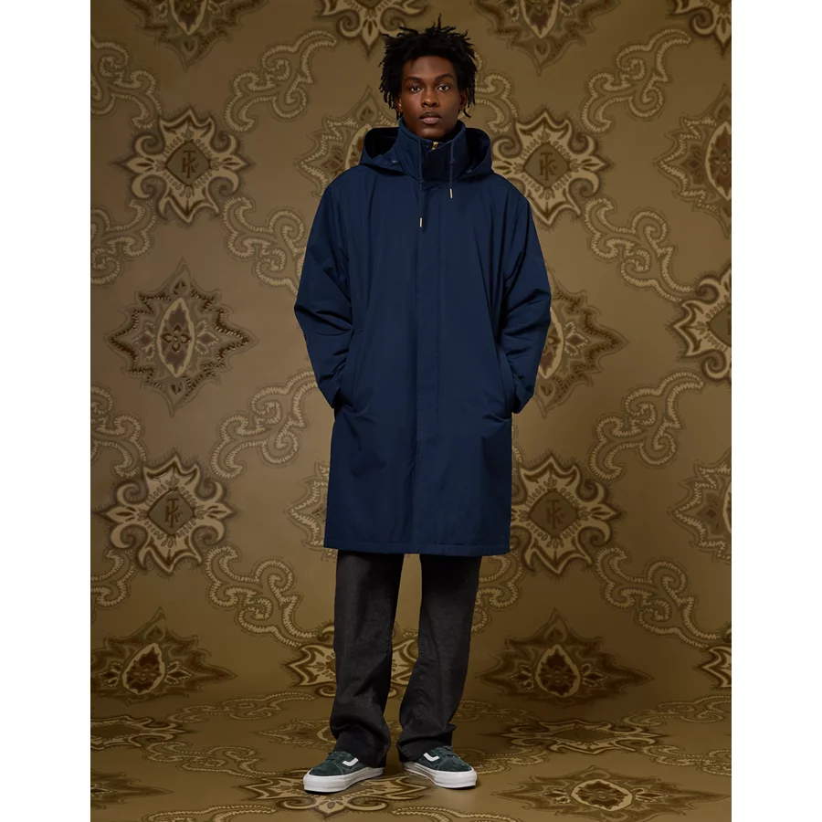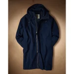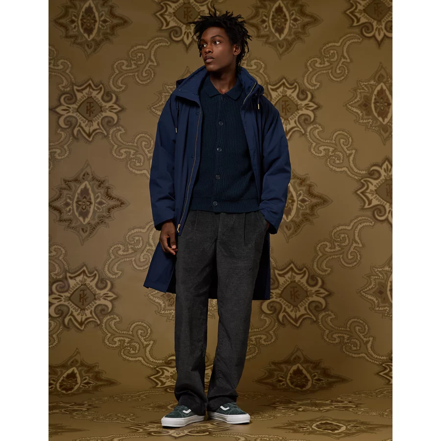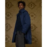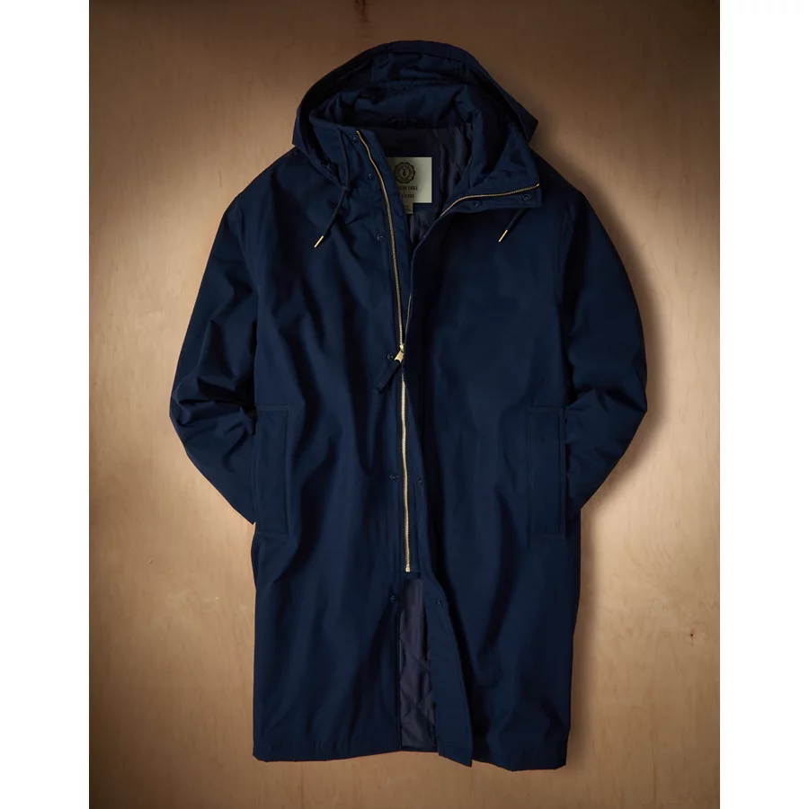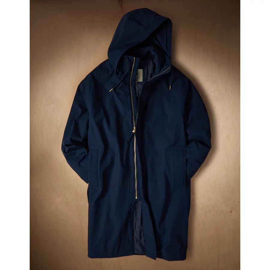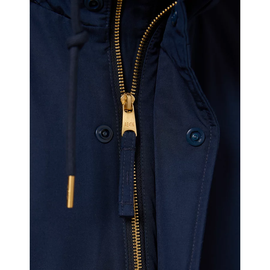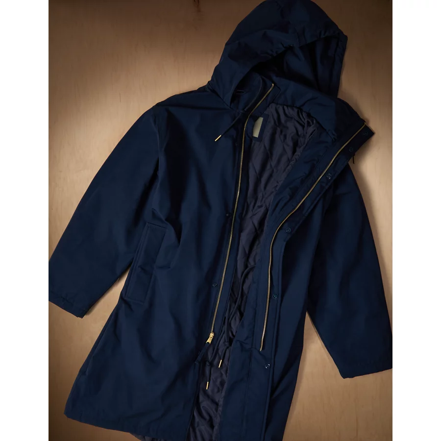 Concealed snap closure with additional gold-tone zipper and drawstring at the neckline