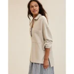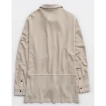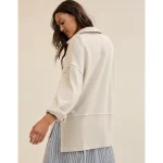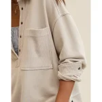 Ribbed trim on the collar, placket, pocket, cuffs, and back