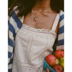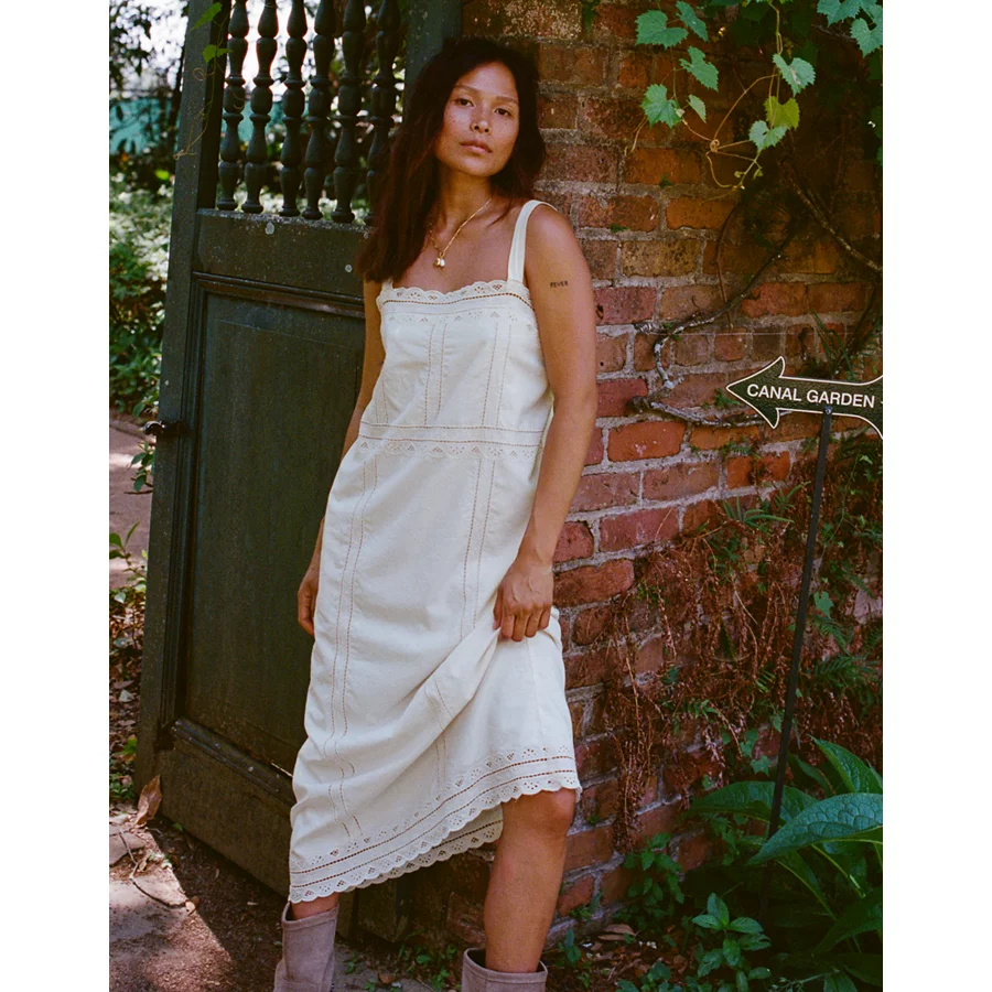 Lightweight gauze fabric with interior lining on top half Smocked waistCenter front slitFunctional buttons on the frontFemme ruffle and crochet