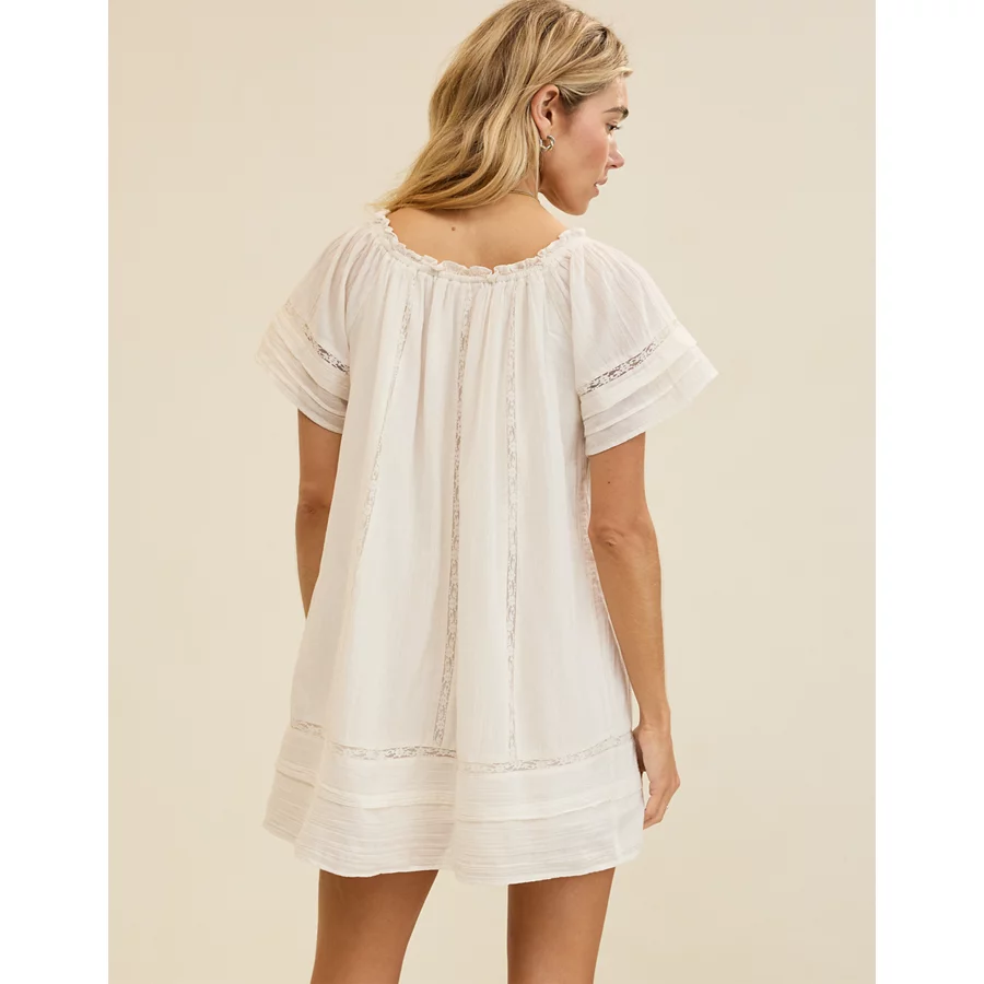 Lightweight gauze fabric with interior lining on top half Smocked waistCenter front slitFunctional buttons on the frontFemme ruffle and crochet
