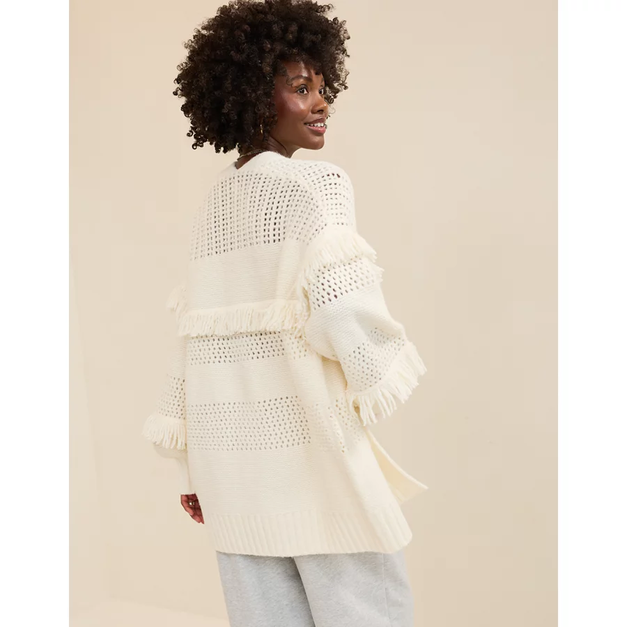 Real Good Everyday yarnRolled necklineRibbed trim on cuffs and hemPointelle deets and split cuffs on the sleevesStripedAccessibility deets: over-the-head access