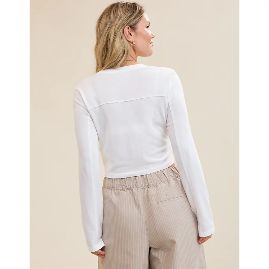 Real Good Everyday yarnRolled necklineRibbed trim on cuffs and hemPointelle deets and split cuffs on the sleevesThis style is heathered