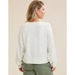 Real Good Everyday yarnRolled necklineRibbed trim on cuffs and hemPointelle deets and split cuffs on the sleevesStripedAccessibility deets: over-the-head access
