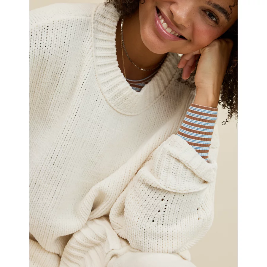 Real Good Everyday yarnRolled necklineRibbed trim on cuffs and hemPointelle deets and split cuffs on the sleevesStripedAccessibility deets: over-the-head access