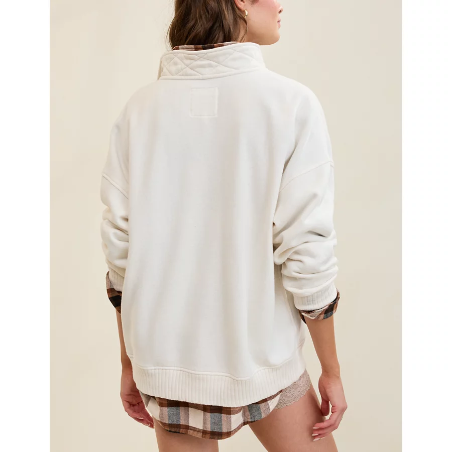 Real Good Everyday yarnRolled necklineRibbed trim on cuffs and hemPointelle deets and split cuffs on the sleevesThis style is heathered