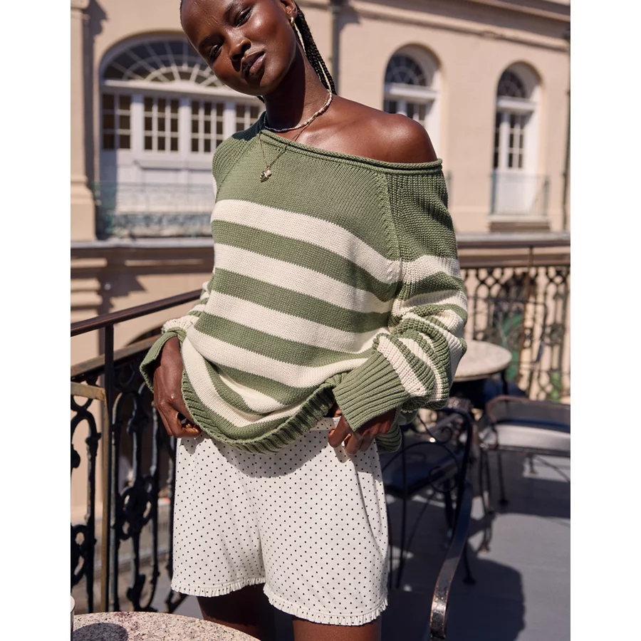 Real Good Everyday yarnRolled necklineRibbed trim on cuffs and hemPointelle deets and split cuffs on the sleevesThis style is heathered