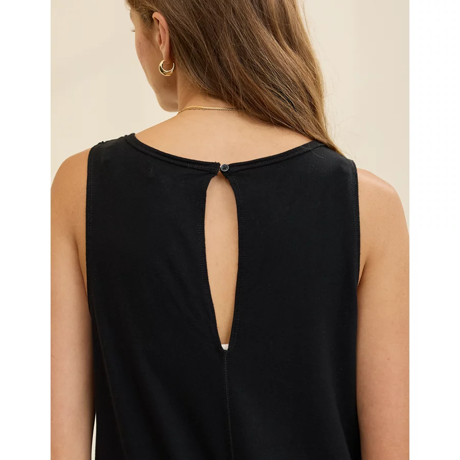 Mixed fabrics! Soft, stretchy knit bodice with a lightweight gauzey skirtScoop necklineSide seam pockets (!!)Accessibility deets: over-the-head access for easy