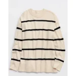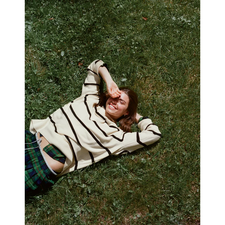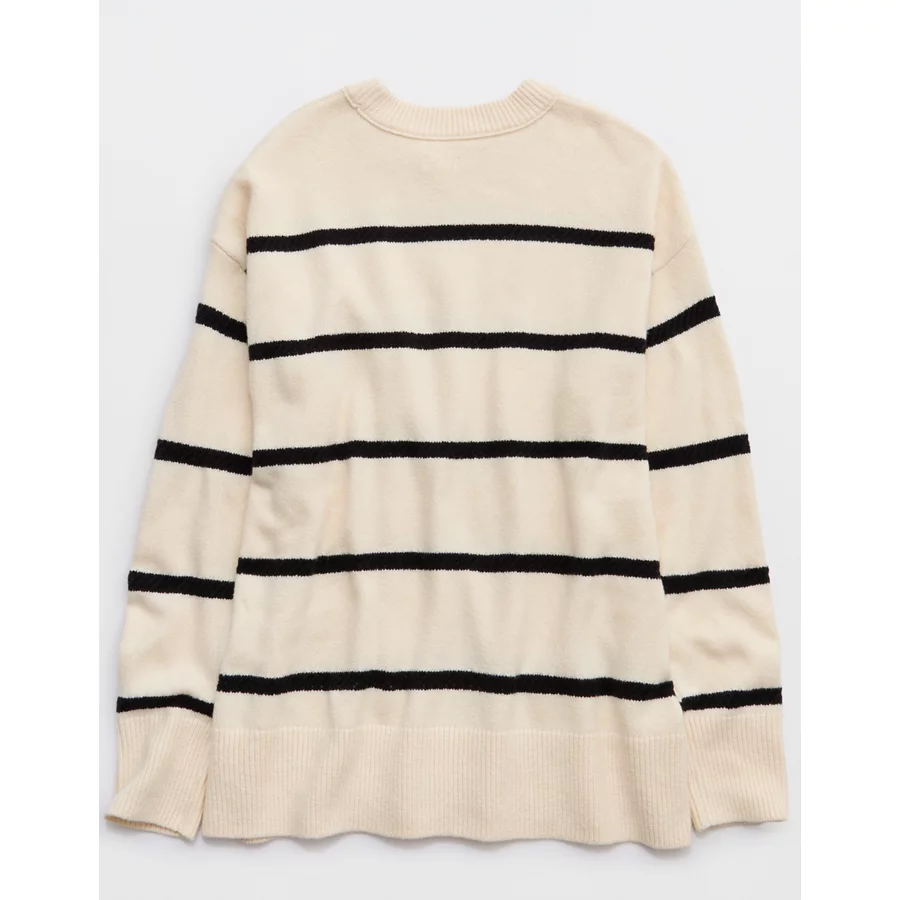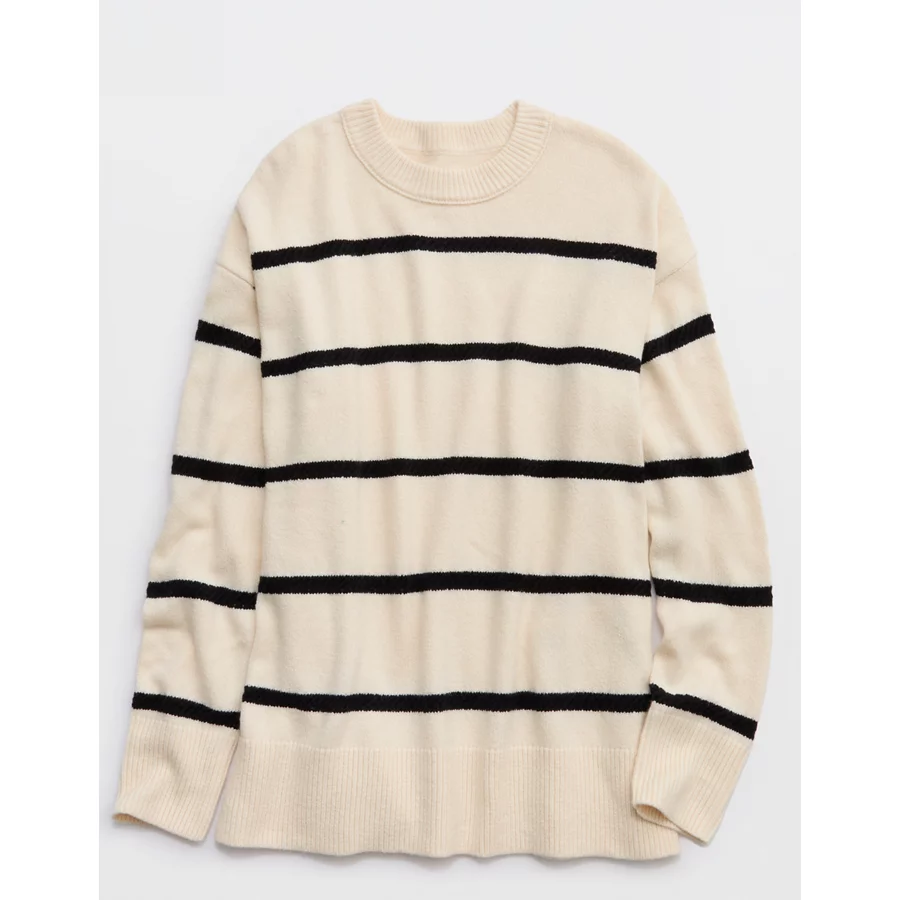Real Good Everyday yarnRolled necklineRibbed trim on cuffs and hemPointelle deets and split cuffs on the sleevesStripedAccessibility deets: over-the-head access