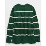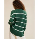 Real Good Everyday yarnRolled necklineRibbed trim on cuffs and hemPointelle deets and split cuffs on the sleevesStripedAccessibility deets: over-the-head access