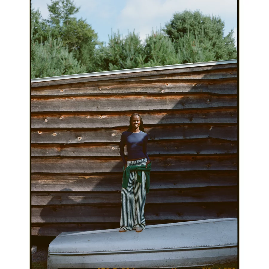Real Good Everyday yarnRolled necklineRibbed trim on cuffs and hemPointelle deets and split cuffs on the sleevesStripedAccessibility deets: over-the-head access