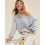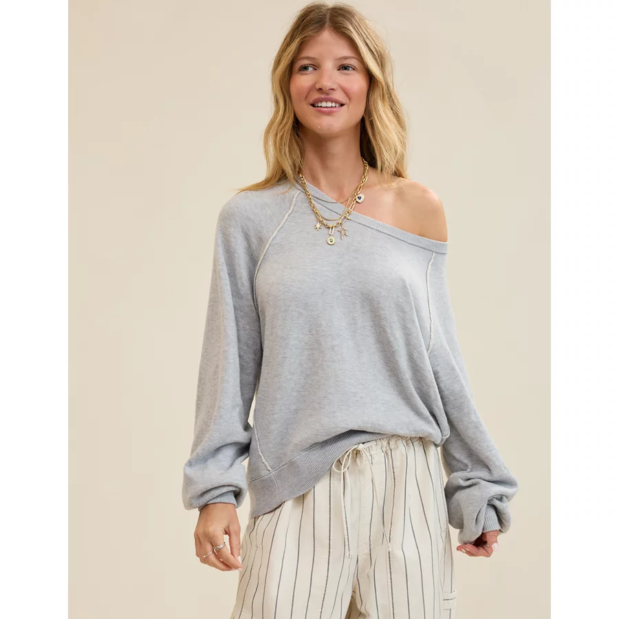 Real Good Everyday yarnRolled necklineRibbed trim on cuffs and hemPointelle deets and split cuffs on the sleevesThis style is heathered