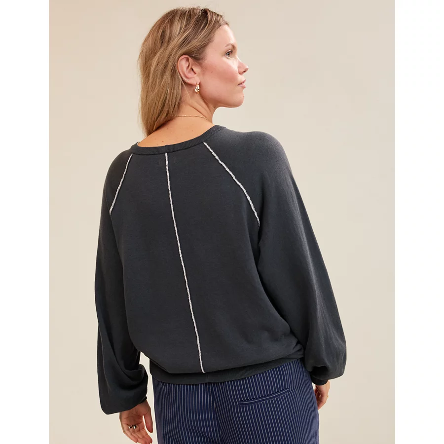 Real Good Everyday yarnRolled necklineRibbed trim on cuffs and hemPointelle deets and split cuffs on the sleevesThis style is heathered