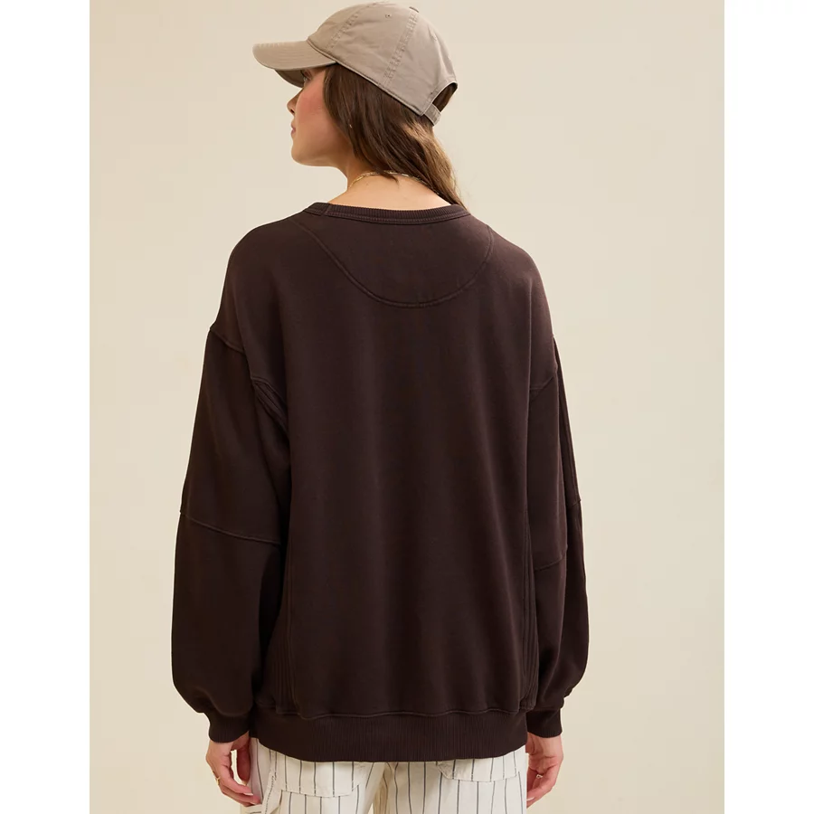 Real Good Everyday yarnRolled necklineRibbed trim on cuffs and hemPointelle deets and split cuffs on the sleevesThis style is heathered