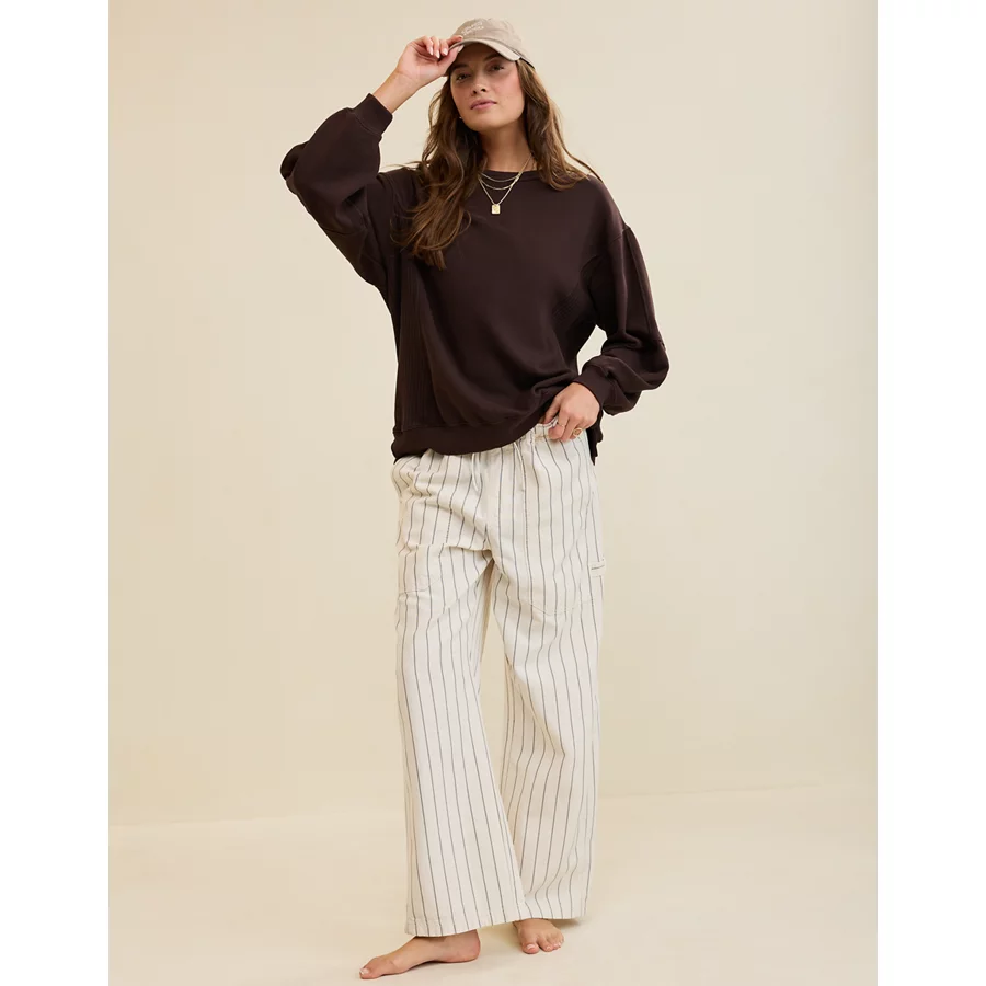 Real Good Everyday yarnRolled necklineRibbed trim on cuffs and hemPointelle deets and split cuffs on the sleevesStripedAccessibility deets: over-the-head access
