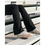 THE FIT: High waisted. 11 leg opening. Full length! Fit + Flare: hugs the leg until below the knee then flares out for a trendy look.