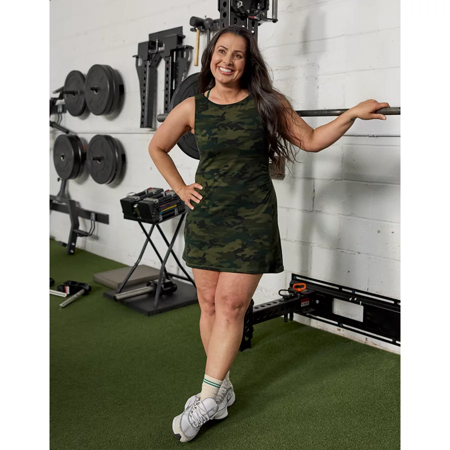 Ultra-soft Real Good Buzzed Terry fabricNEW! UPF 50 sun protectionStrappy back deets! 85% Recycled Nylon, 15% ElastaneUse a mild detergent