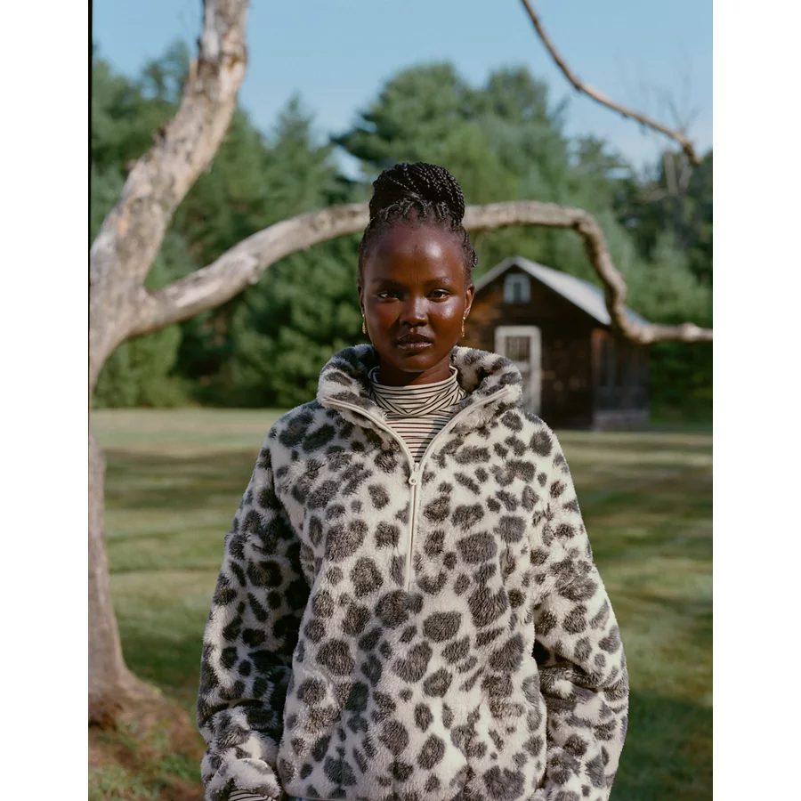 THE LOOK: Like a teddy bear you can wear. Quarter zip neckline.