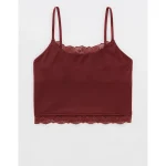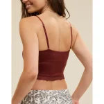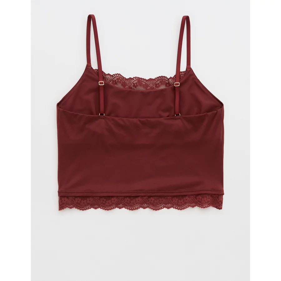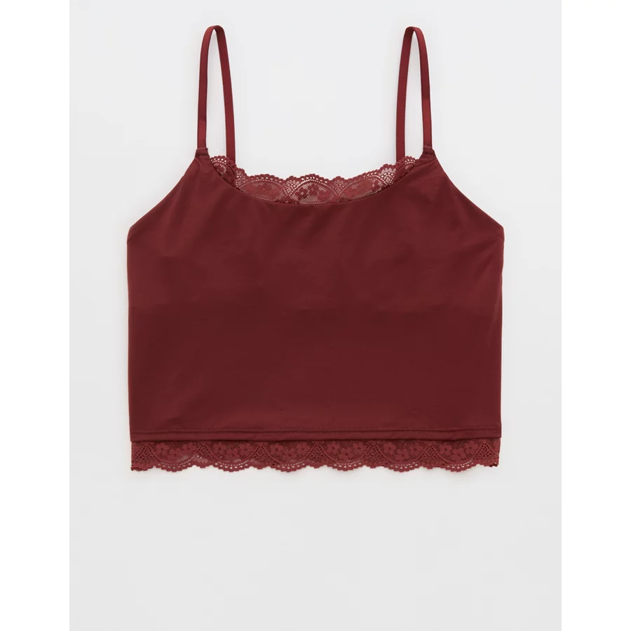 Design: Lace trim along neckline and bottom hem. Crop length hits at waist.