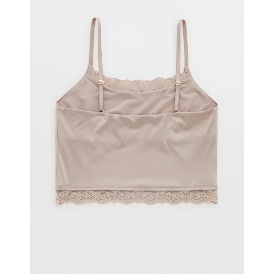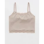Design: Lace trim along neckline and bottom hem. Crop length hits at waist.