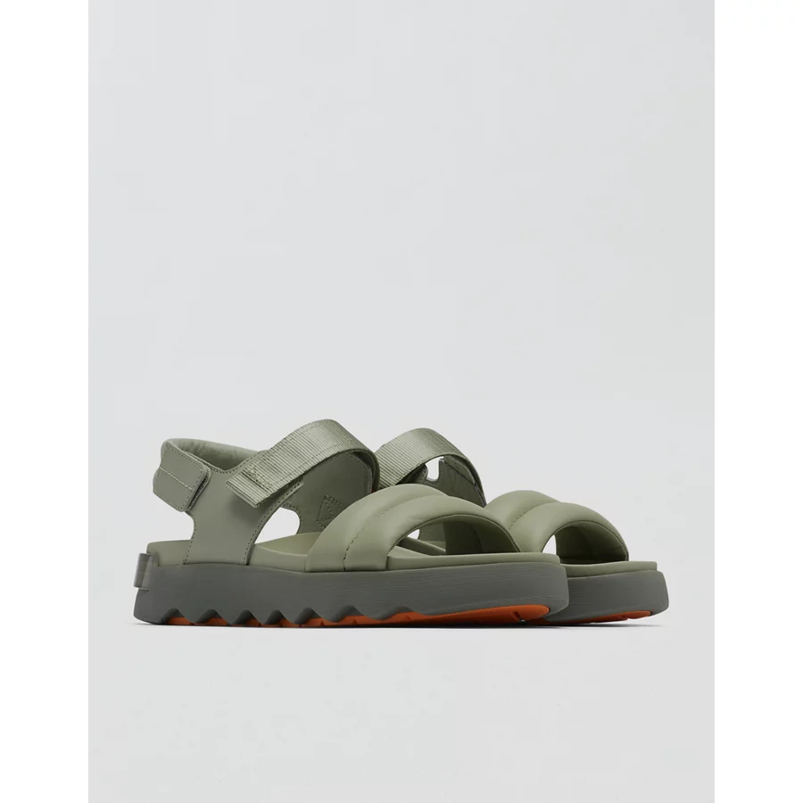 Upper: Full grain leather upper with puffed forefoot detailing. Two points of adjustability – midfoot webbing strap and heel leather ankle strap with hook and loop closures. Synthetic leather lining.